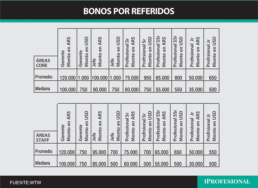 Los bonos por profesionales semi-senior son de 65.000 pesos, independientemente del área en la que se inscriban, pero en dólares varían entre USD800 y USD650). Y los montos menores son por referir profesionales junior, por los que el empleado puede cobrar unos 50.000 pesos o hasta USD650 si su compañía abona este plus en moneda extranjera.